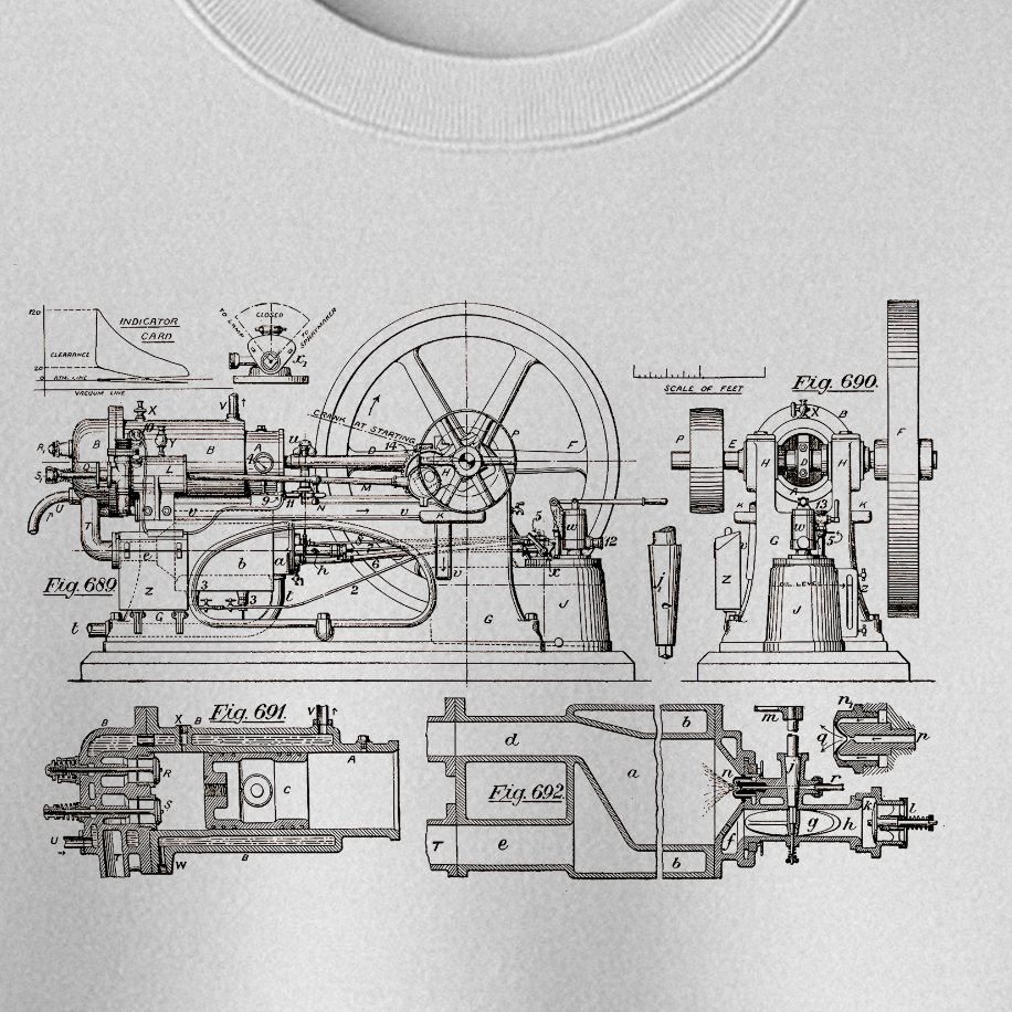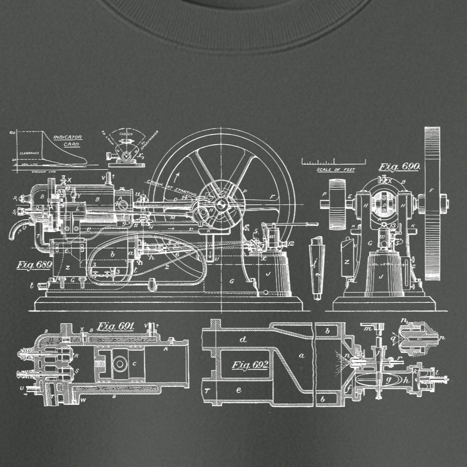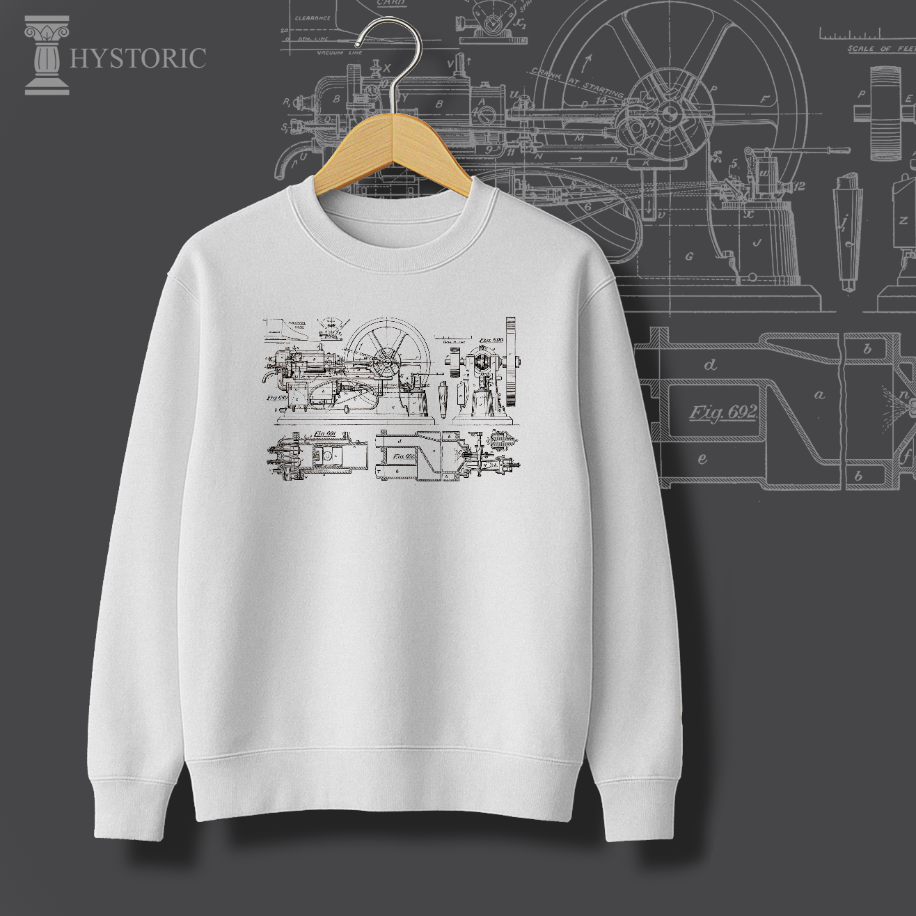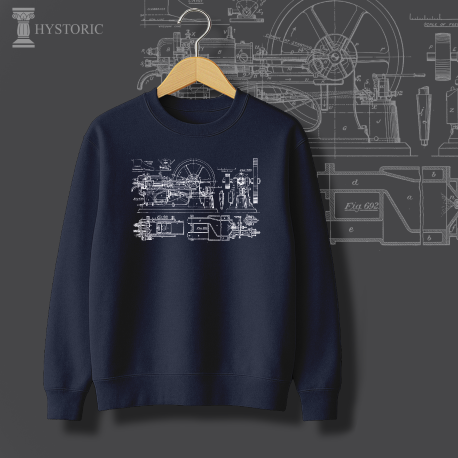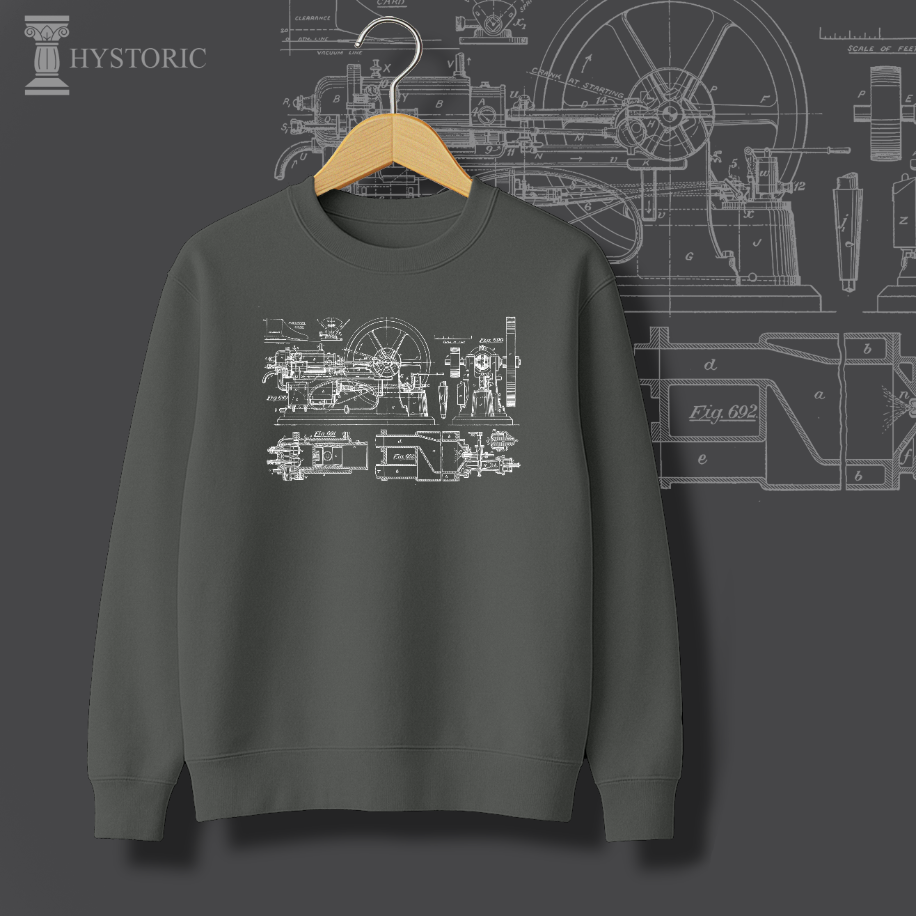 Tasarım dili, bu yeni çağın ruhunu mükemmel bir şekilde yansıtıyor. Dönemin “endüstriyel” ve rasyonel estetiğini, soğuk ve net bir “teknik çizim” (blueprint) stiliyle sunuyoruz. Süslemenin bittiği, mühendisliğin ve mekaniğin başladığı o hassas çizgiler… Bu sweatshirt, bir motor şemasından çok daha fazlasıdır; o, insan iradesinin doğayı şekillendirme gücünün bir kanıtı ve bizi doğrudan “Modern Çağ”a taşıyacak olan enerjinin ta kendisidir.