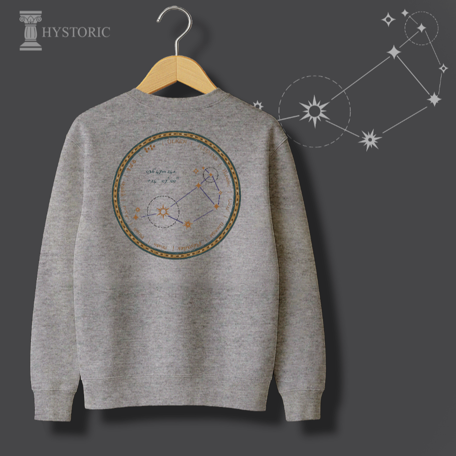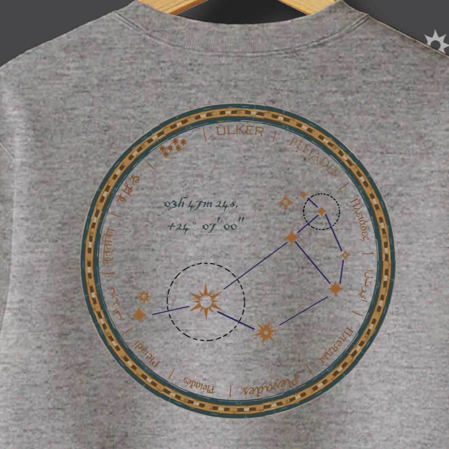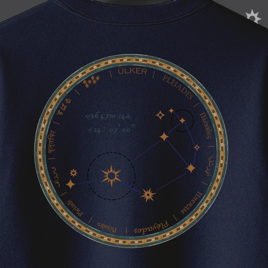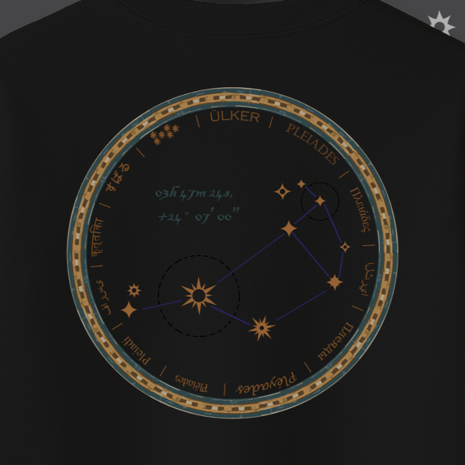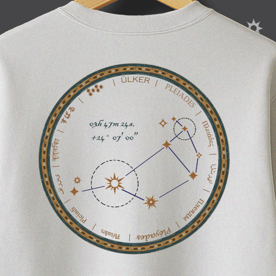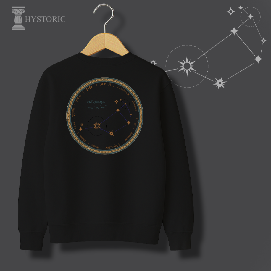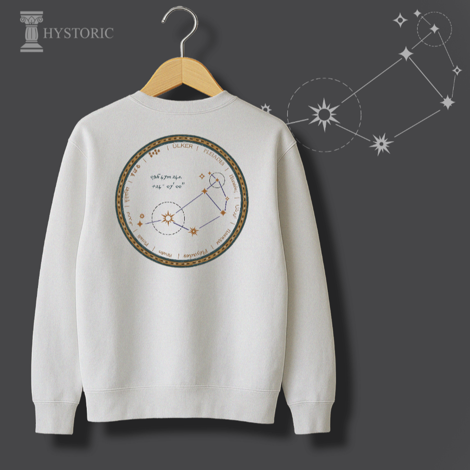 İnsanlık, medeniyetini gökyüzüne bakarak kurdu. Humanity Collection’ın bu özel tasarımı, Antik Çağ’ın en büyük bilimsel sıçramasını, yani gök cisimlerini okuma sanatını kutluyor. Sweatshirt’ünüzün sırtında yer alan bu dairesel motif, sadece bir yıldız haritası değil; Sümer’den Antik Yunan’a kadar pek çok medeniyette denizciliğe yön vermiş, hasat zamanını belirlemiş ve ilk takvimlerin temelini oluşturmuş Ülker (Pleiades) Takım Yıldızı’nın otantik bir haritasıdır. Antik yazıt ve sembollerle işlenen bu desen, bilginin karanlığı aydınlatan gücünü ve evrensel merakımızı sembolize eder.