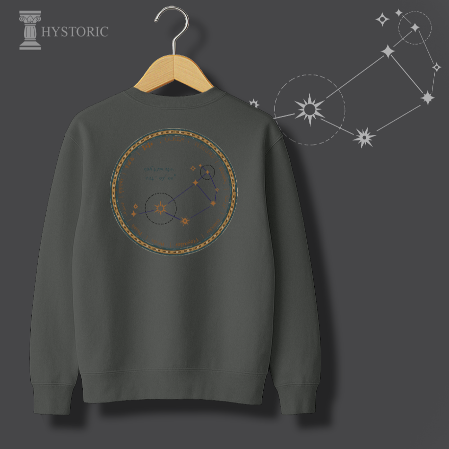 Bu sweatshirt, Hystoric Wear’ın vaadi olan felsefi giyim anlayışının premium bir örneğidir. Koyu lacivert zemin üzerine zarifçe işlenmiş detaylar, tasarımı sade bir giysiden çıkarıp, adeta bir antik astronomi diski ya da giyilebilir bir sanat eserine dönüştürür. Üzerinizde taşıyacağınız bu parça, modern dünyanın tüm karmaşası içinde, insanlığın ilk ve en büyük macerası olan bilimsel keşiflere olan saygınızı gösterir. Bu, sadece bir yıldız haritası değil, insan zekasının evrene attığı ilk imzanın modern bir yansımasıdır.
